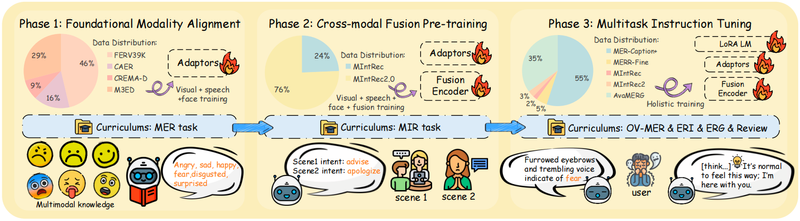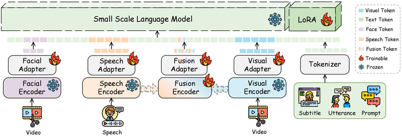 该研究主要聚焦多模态情感语言模型长期面临的低层次感知与高层次交互断层、情感能力碎片化、资源消耗过高的关键挑战。当前情感计算模型大多局限于单一认知层级,难以实现从情绪感知到共情交互的全链路统一,且大参数模型的高算力需求严重制约了轻量化部署。针对上述问题,团队提出认知启发的三级情感任务层级框架,设计出轻量化多模态语言模型Nano-EmoX与P2E(Perception-to-Empathy)渐进式训练框架。